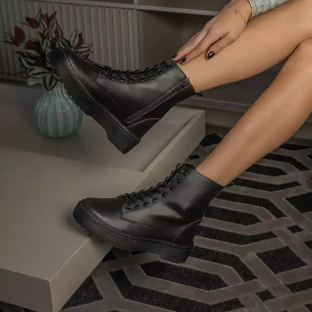 o Coturno Militar Feminino 202 da GuGi, é sinônimo de glamour e elegância. O modelo, é extremamente marcante, ou seja, é ideal para as mulheres ligadas na moda que não querem passar despercebidas. Fabricada através de material ecológico de primeira qualidade, o modelo é bastante resistente, porque possui solado de borracha com as laterais costuradas para maior resistência e durabilidade. Sua palmilha espumada, proporciona mais conforto e flexibilidade aos pés no seu dia a dia. Além disso, o fechamento do coturno pode ser feito através de amarração ou com o zíper lateral. Se você busca por qualidade indiscutível, conforto incomparável e design único, acabou de encontrar o produto ideal!