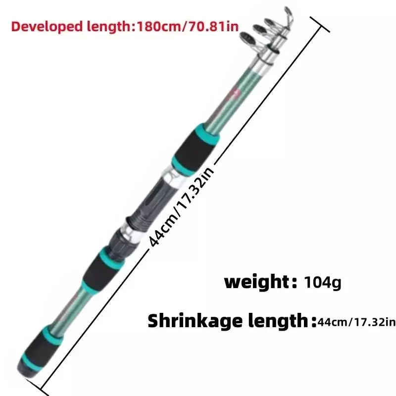 Vara de pesca:Material: Fibra de carbonoComprimento: 1,8mO material de fibra de vidro de alta densidade torna a vara de pesca dura e durável.A vara de pescar é telescópica e portátil, muito conveniente para transportar.